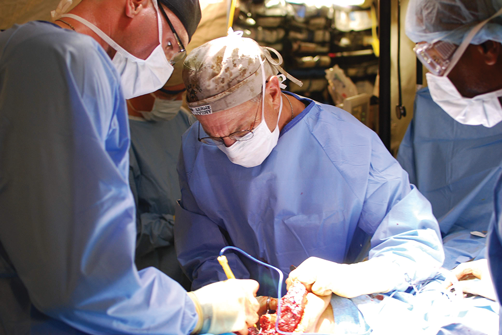 One Navy Corpsman was brought into our trauma bay with grave injuries: the loss of both legs above the knee, loss of one arm at the elbow, and partial loss of his other hand. When we rushed him to the OR, we were shocked to find a large gun barrel and webbing around one of his amputation stumps. Despite his catastrophic injuries, he had directed his platoon Marines to make an improvised tourniquet out of a web belt and the barrel of a 240 Golf machine gun. A standard tourniquet would not have worked on an amputation so high on his right thigh. No doubt he saved his own life with his quick thinking.