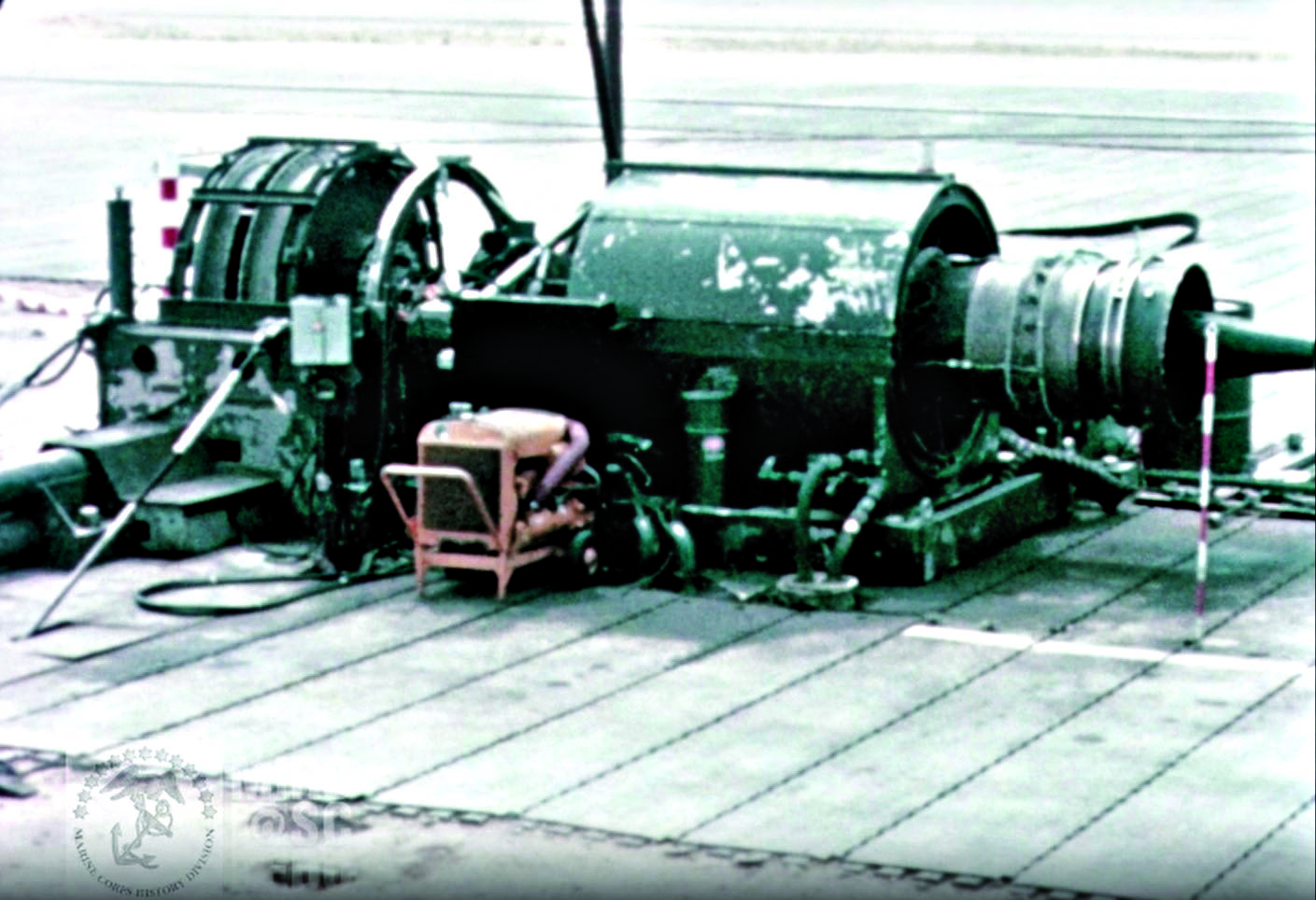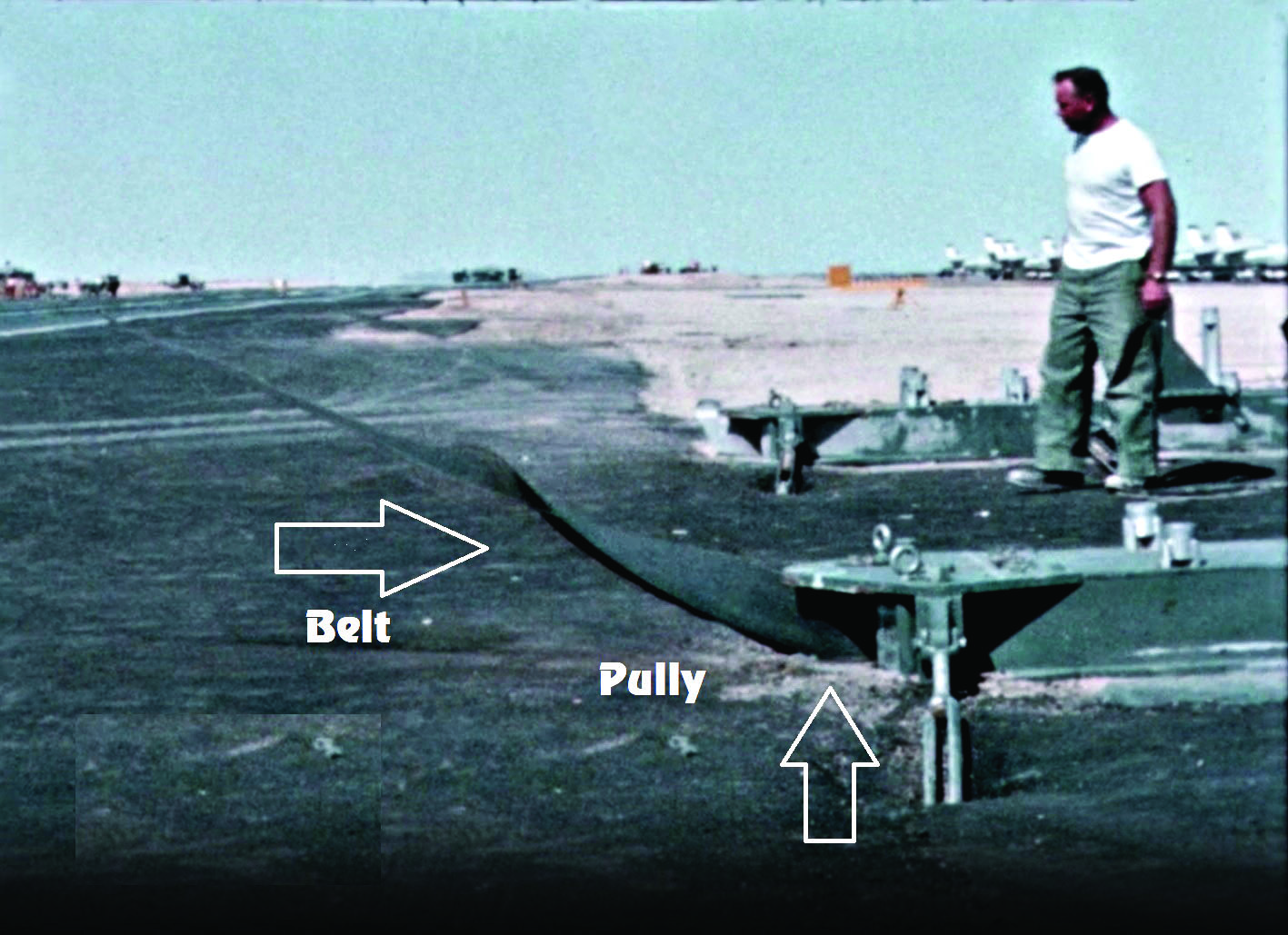 The SATS catapult system used a standard GE J79 jet engine (above) as its power source to drive the catapult. The engine was then linked to a high-tension catapult belt (right). While pilots initially used jet-assisted takeoff (JATO) bottles during the base’s first weeks, the installation of this engine-driven catapult system completed Chu Lai’s transformation. (Photos courtesy of Lawrence Krudwig)