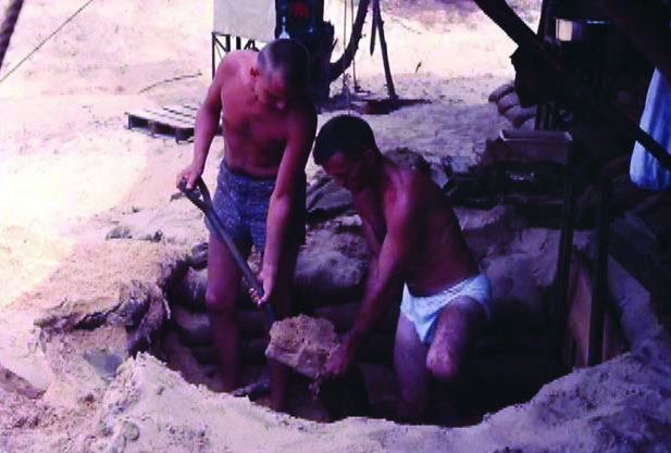 Sandbagged safety and security bunkers had to be dug by hand, but for every two shovels full that were thrown out of a hole, one shovel full trickled back in. Bunkers often had to be three to four times in diameter bigger than needed before the first row of sandbags could be put in place. The sand was equally problematic for personnel, as it got into everything from toothpaste and shaving cream to food and bedding.