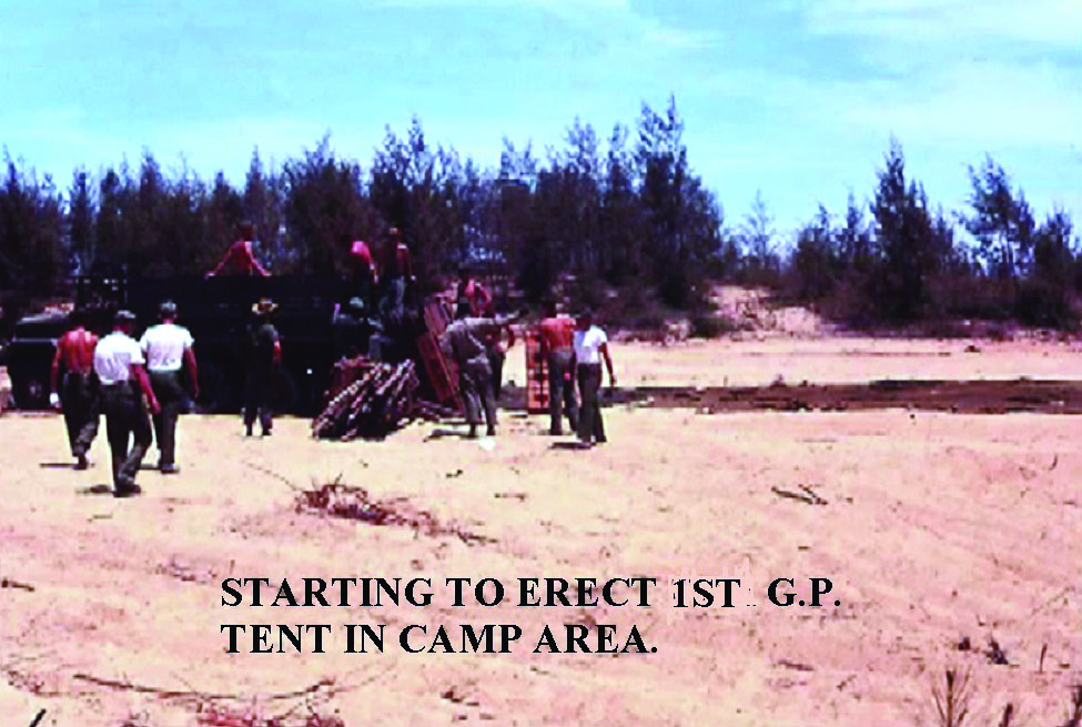 According to unit diaries and other documents, only two days into excavation, things were going painfully slow. It became clear the sand was going to wreak havoc on this project. With a deadline of May 29, the construction battalion began working 24/7 moving dirt from a nearby hill, dumping and grading 64,500 cubic yards of the laterite. However, this approach would ultimately need ongoing and continued maintenance after any heavy rain, as the sand below would soften and collapse. Simultaneous with air-field construction, the servicemembers continued working on the basic camp facilities, security and communications.