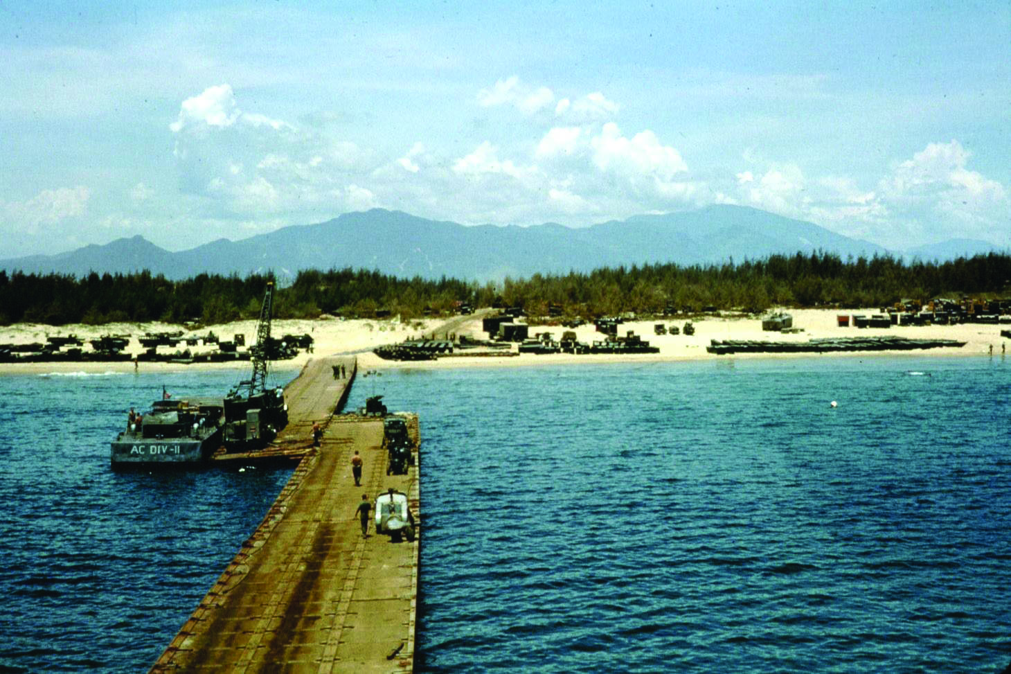 The NMCB’s transportation was entirely different, since their primary point of departure was composed of two sections from Port Hueneme and Point Mugu, Calif., following two separate exercises to Camp Kinser, Okinawa. On April 29, the NMCB, along with the 3rd Marine Expeditionary Brigade, left for Vietnam aboard two LSTs, an LSD and an attack cargo ship as part of the III Marine Expeditionary Force. The Marine brigade, acting as the advance element of a larger force, had the initial goal of hitting the beach, securing the area and acting as security for the construction and the air wing units soon to follow. They landed at 8 a.m. on May 7.