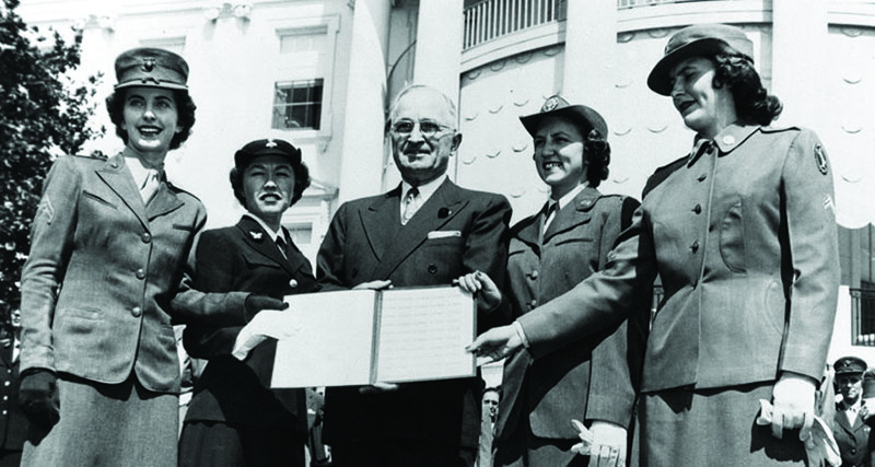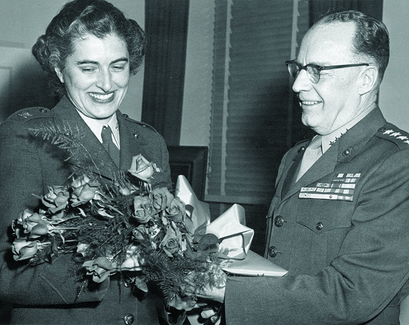 The 21st Commandant Randolph M. Pate presents a bouquet to Col Julia E. Hamblet, the director of Women Marines, on the 14th anniversary of the founding of the Marine Corps Women’s Reserve on Feb. 13, 1957.President Harry S. Truman signs the Women’s Armed Services Integration Act, June 12, 1948.