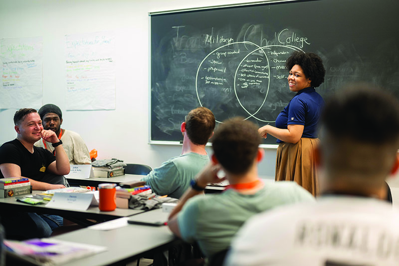 Veteran Shane Kissinger collaborates with participants at a WSP academic boot camp, where community-building is a core component of the program. (Photo by Sameer Khan for Warrior-Scholar Project)