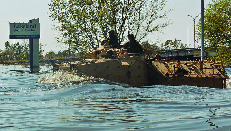 The AAV still proved useful in humanitarian operations around the globe. In 2004, the 15th MEU used AAVs, in conjunction with helicopters and landing craft, air cushion, to provide aid to Indonesia in the wake of a devastating tsunami. The amtrac Marines used AAVs in Louisiana and Mississippi in the aftermath of Hurricane Katrina in 2005, and in 2018 in North Carolina in the wake of Hurricane Florence, to deliver much-needed emergency supplies and evacuate victims.
