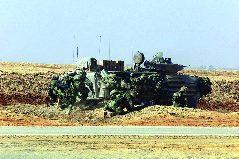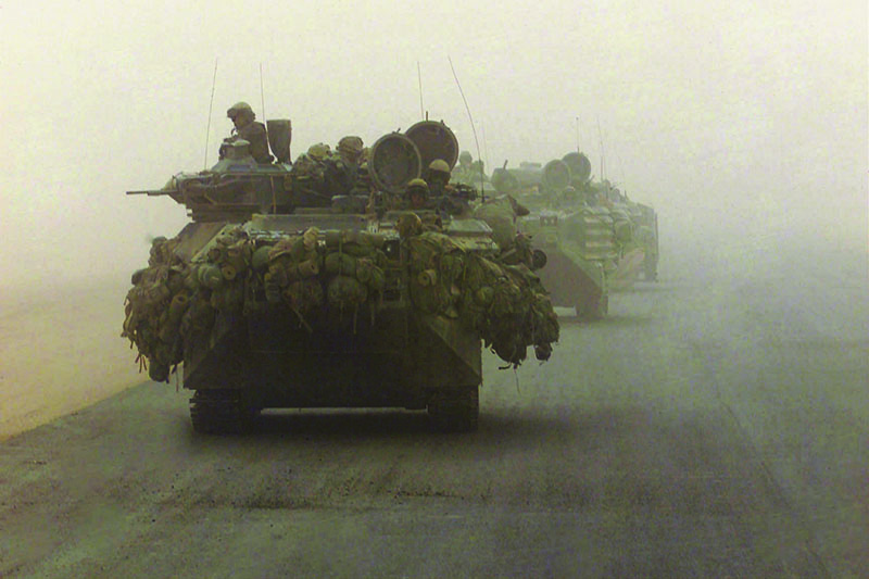During the aftermath of 9/11, the AAV7A1 RAM/RS with EAAK armor found itself participating in the global war on terror, though it never served in Afghanistan. Its next big deployment would be in Operation Iraqi Freedom in 2003. Unlike in Desert Storm, where several of the Marine task forces walked into Kuwait by foot, the entire Marine Corps that participated in the invasion was mechanized, using humvees, medium tactical vehicle replacements and the venerable AAV. These amtracs crossed the line of departure carrying Marines who braced themselves from the fold-open roofs. Spending hours shut inside the vehicle was uncomfortable and hot, often causing motion sickness.