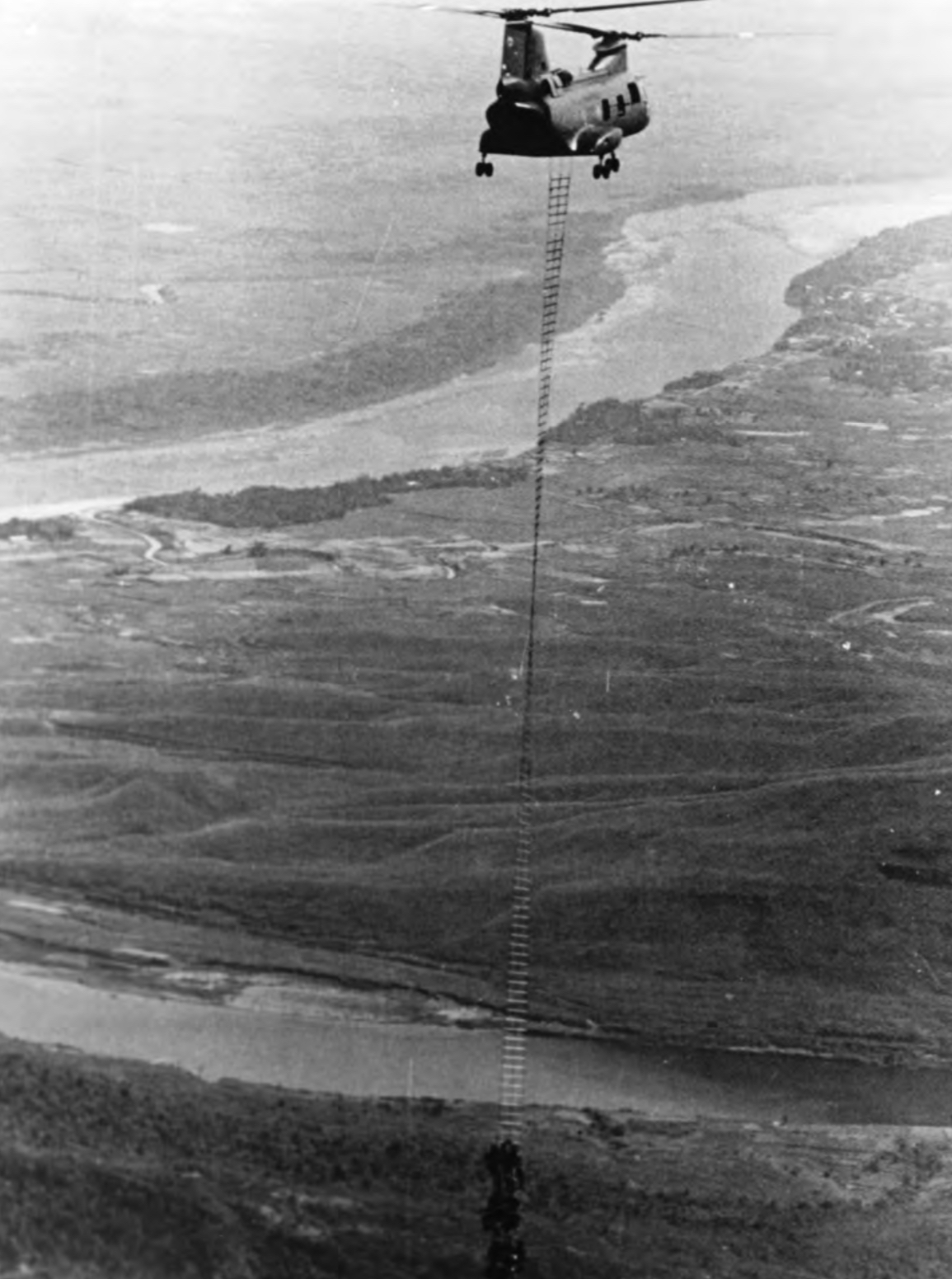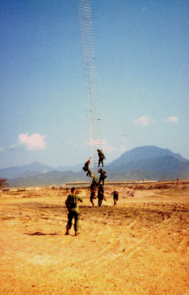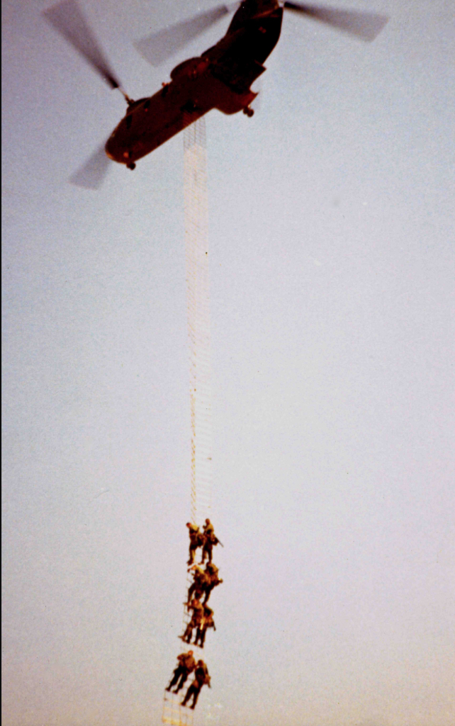 Major Roger Simmons, commanding officer (CO) of 1st Force Recon, tasked Lt Finlayson with finding an alternative. To help, he sent Finlayson to the Army’s elite Studies and Observations Group (SOG). Their experience inserting and extracting teams deep behind enemy lines inspired numerous devices for the task. Finlayson borrowed two concepts: the Stabilized Body (STABO) harness which seemed simple enough to adapt and produce and a giant swinging ladder.